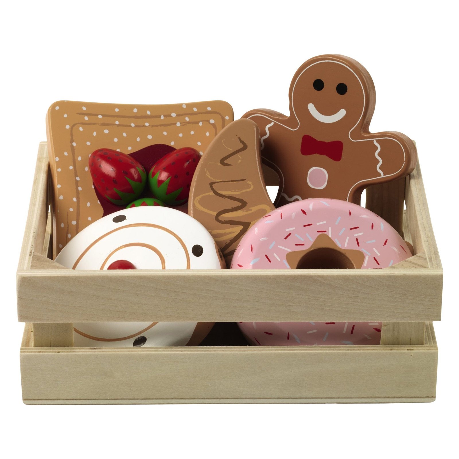 The set includes a strawberry tart, a Danish pastry, a doughnut, a croissant and a gingerbread man, charmingly stored in a wooden storage crate.