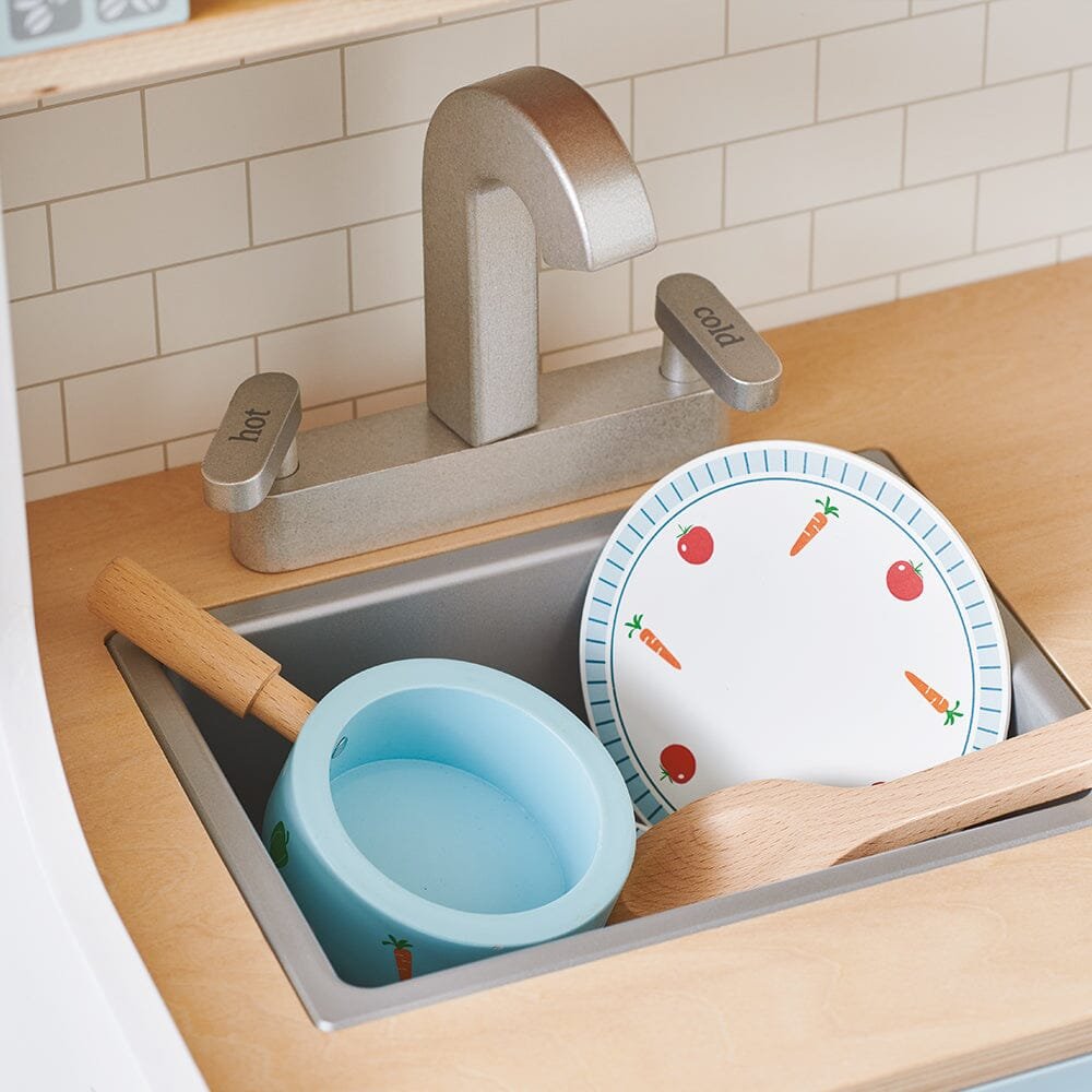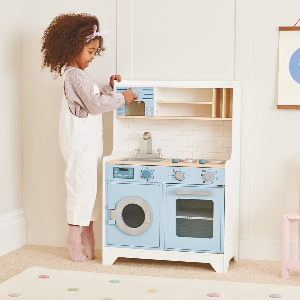 Our Coffee Bean Wooden Toy Kitchen has everything budding chefs need to cook up a storm. There’s plenty of shelf space, a sink, coffee maker, oven and washing machine, plus illustrated dials that click when they’re turned. We’ve designed this piece to blend into interiors so it’s a great option if you don’t have a separate playroom; the combination of muted petrol blue and natural wood is so chic!
