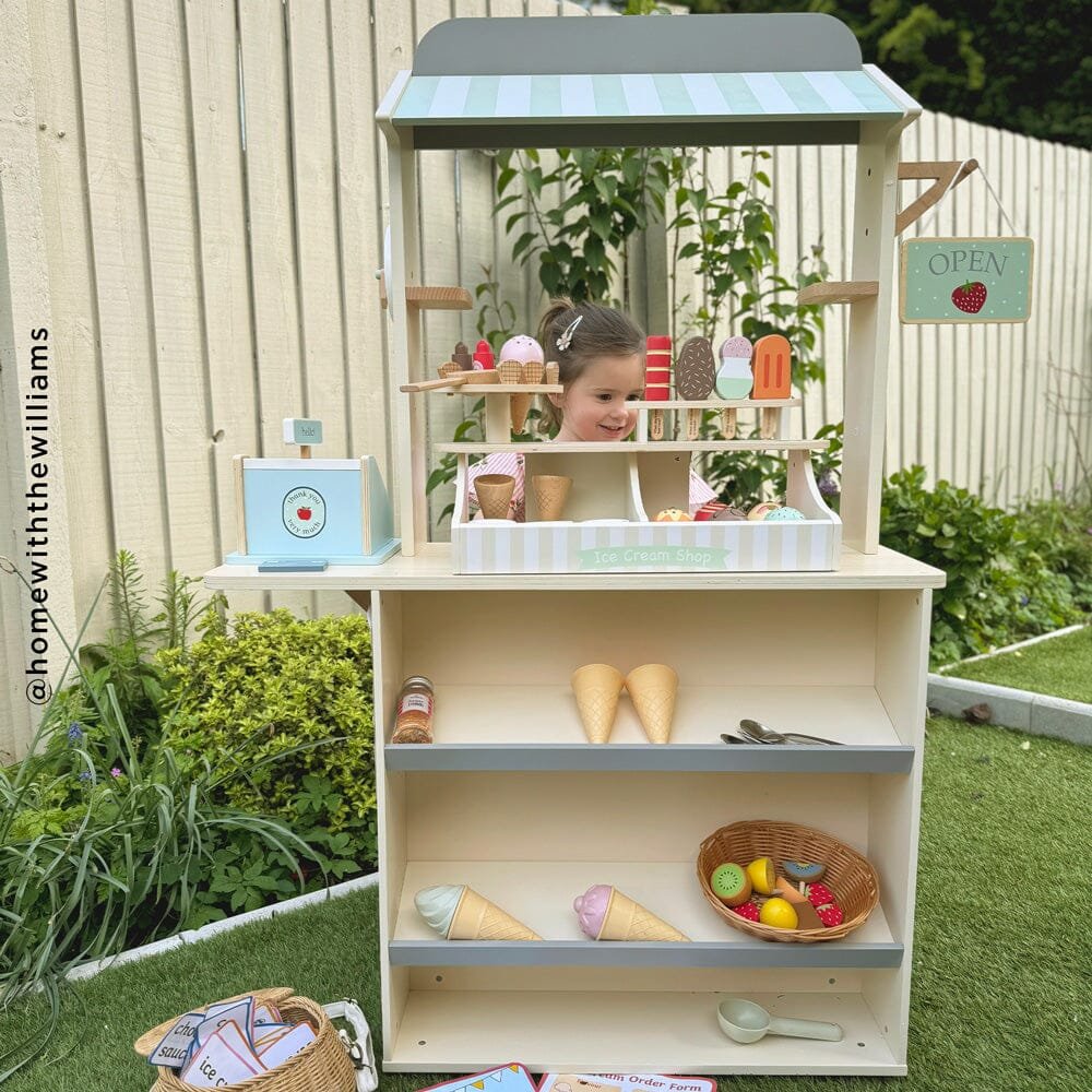 Our wooden play shop is packed with fun features to encourage hours of role play. Whether they serve friends, family or teddy bears, there’s plenty to keep children entertained; from stacking the shelves to writing on the chalkboards, adjusting the time on the clock and using the reversible sign to indicate whether they’re open or closed – busy shopkeepers need to take occasional breaks, after all!