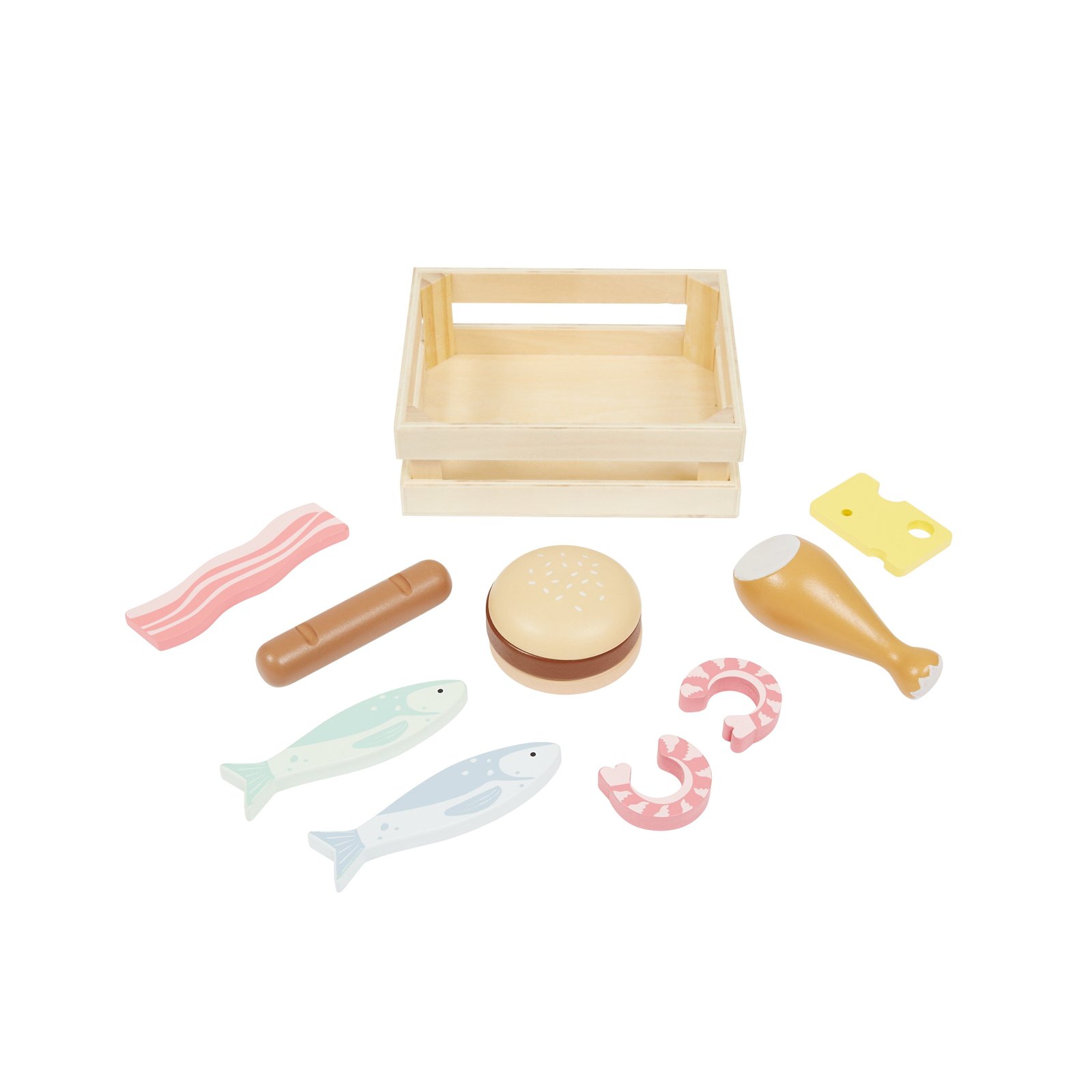 No teddy bears’ picnic would be complete without this fabulous playset. Neatly packaged in a cute wooden crate, our Deli Box contains 10 wooden food pieces including a chunk of cheese, fish, burger, bun, prawns, sausage, bacon and a chicken drumstick.